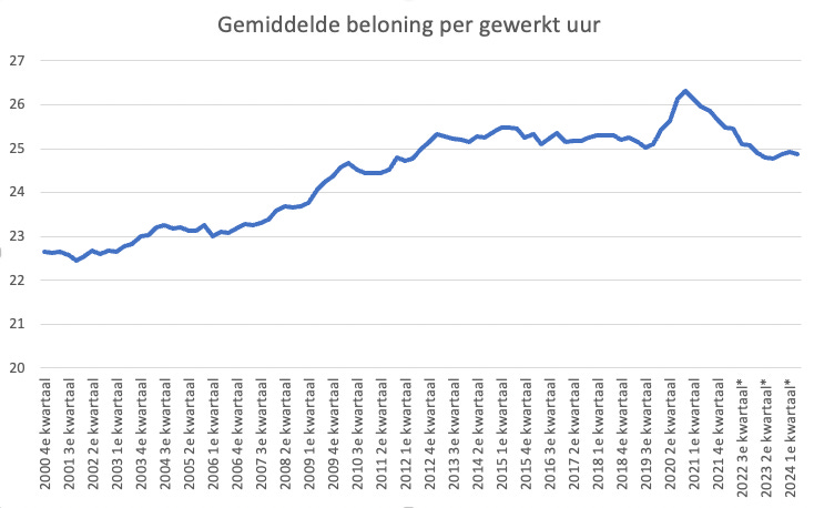 Ondertussen is de gemiddelde reële beloning per gewerkt uur gezakt naar het niveau van 2012 (!). Laat dat even op je inwerken: het gemiddeld uurloon is mínder waard dan een decennium geleden. In diezelfde periode zag de Quote 500 (vanaf 2013), hun vermogen gecorrigeerd voor inflatie met bijna 70 procent(!) stijgen.