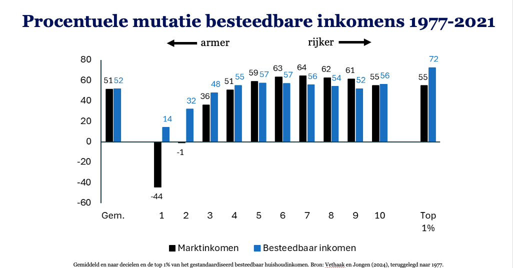 De besteedbare inkomens (ná herverdeling) van deze huishoudens stegen wel, al zij het mondjesmaat. De reden dat deze besteedbare inkomens tóch stegen is dankzij herverdeling door de overheid. Toeslagen, dus.