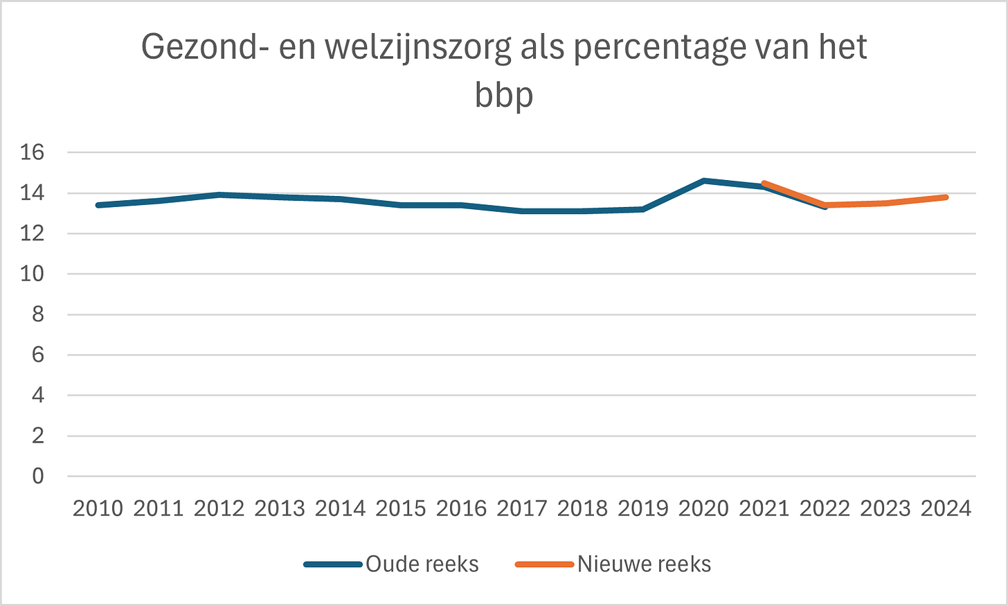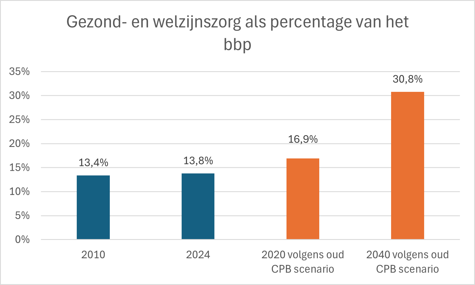 Het CPB verwachtte in 2022 dat we in 2040 ongeveer 20 procent van het BBP besteden aan zorg. Terwijl een recentere RIVM studie (2024) schat dat dit in 2040 is gestegen naar 13,6 procent van het BBP. Een aanzienlijk verschil.
